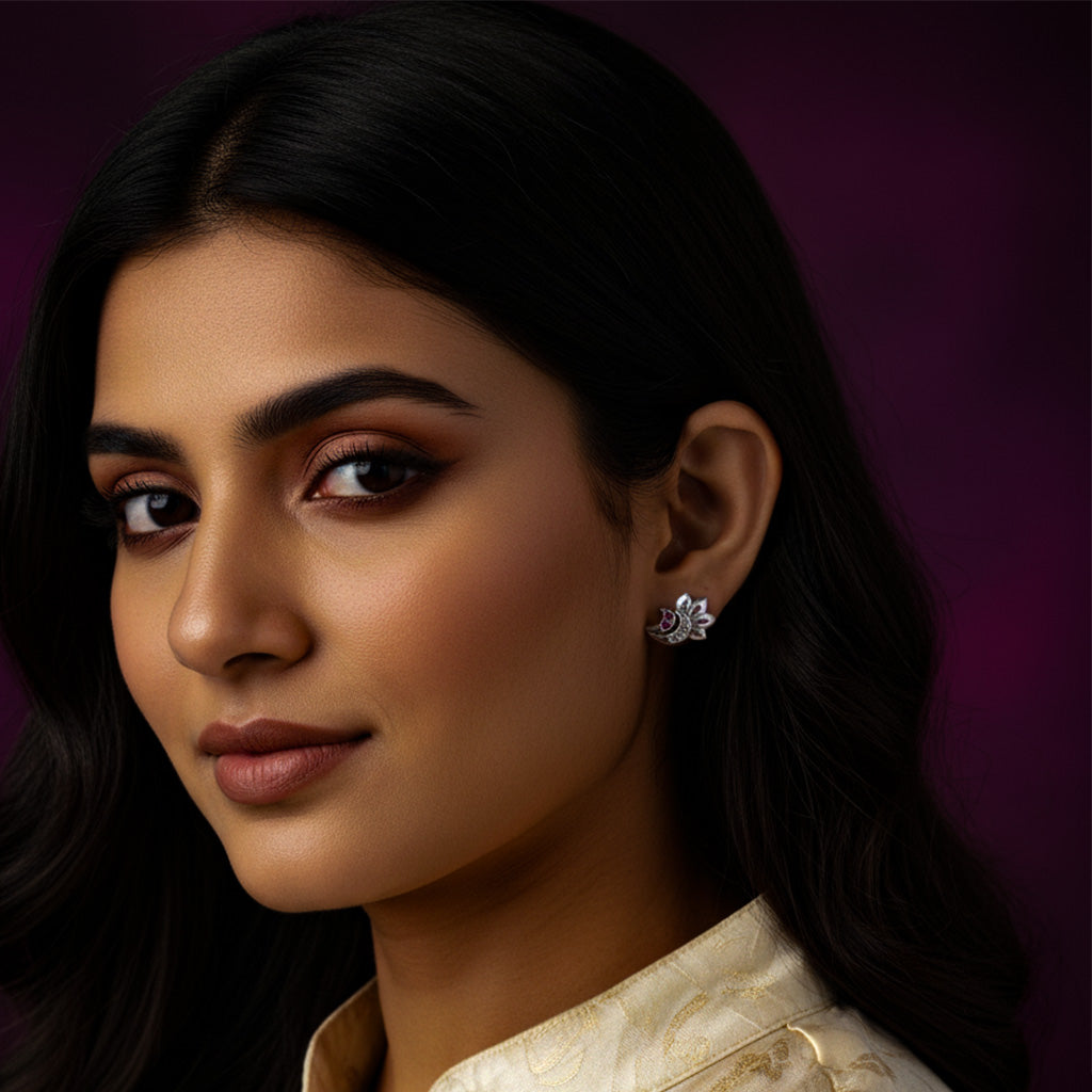 Crafted from 92.5 sterling silver with oxidized detailing, these crescent moon and floral stud earrings feature dazzling ruby and white cubic zirconia gemstones. Their elegant design captures a celestial charm, making them perfect for special occasions and festive wear. The secure push-back closure ensures comfort while highlighting your appreciation for refined, nature-inspired jewelry.