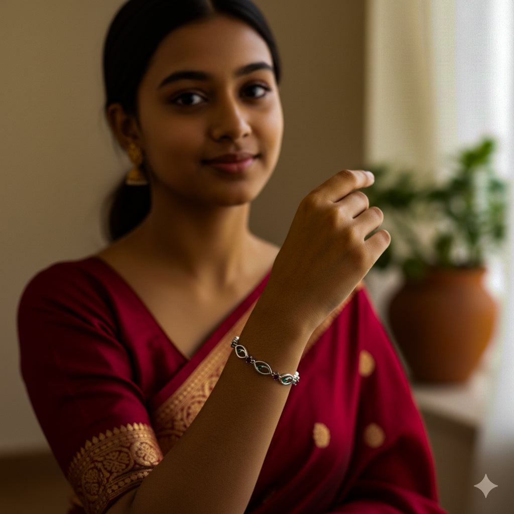 A delicate bracelet featuring marquise-shaped motifs with sparkling green accents, beautifully linked with crimson floral details.