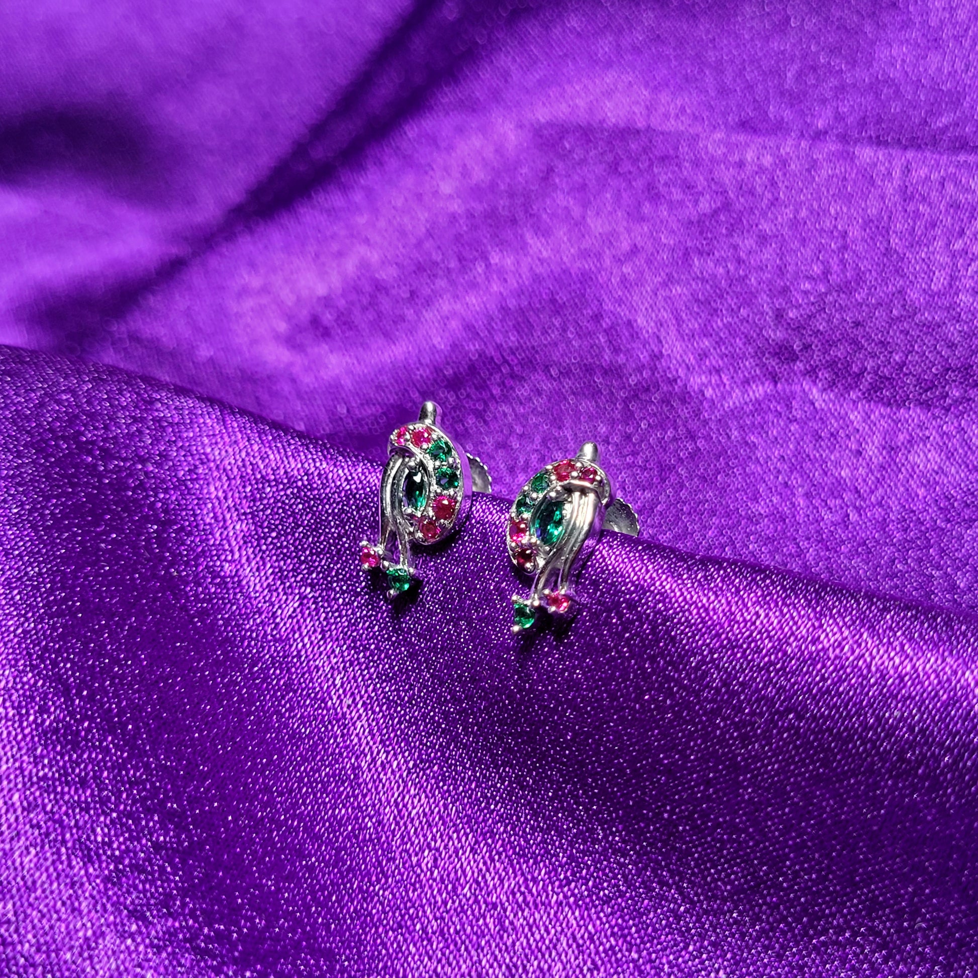 A stunning pair featuring an artistic curved design adorned with sparkling green and pink gemstones. A perfect blend of elegance and vibrancy for any special occasion.