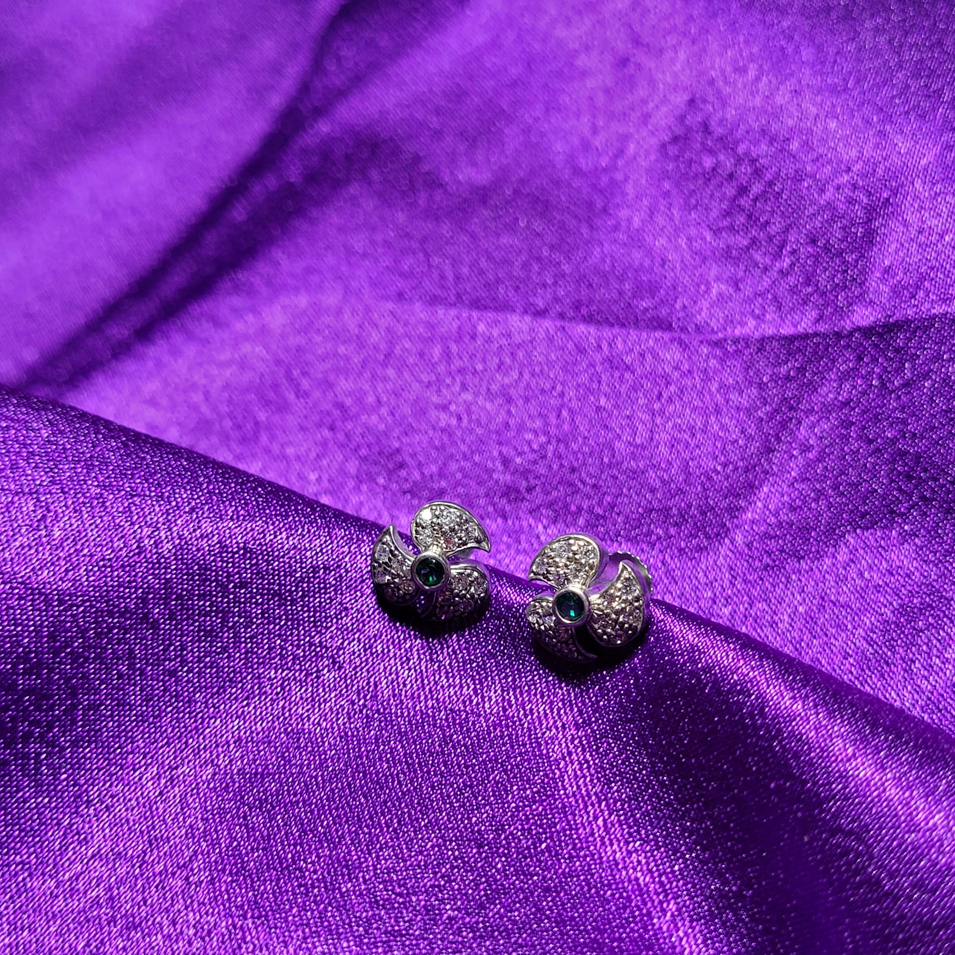 A beautifully crafted pair of earrings featuring a pinwheel-inspired design with sparkling white stones and a striking green center stone. Perfect for adding a touch of sophistication to any outfit.