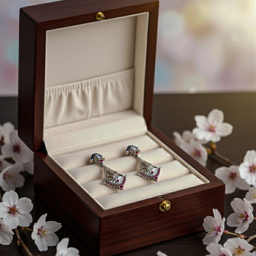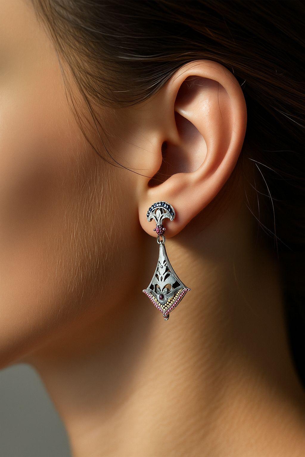 Elegant Silver Pink & Blue Gemstone Earrings feature meticulously crafted silver settings that highlight the vivid pink and blue gemstones. Designed with precision, they offer a refined elegance suitable for both professional and special occasions. The harmonious color pairing and quality materials ensure durability and lasting appeal, making these earrings a distinguished choice for a sophisticated jewelry collection.