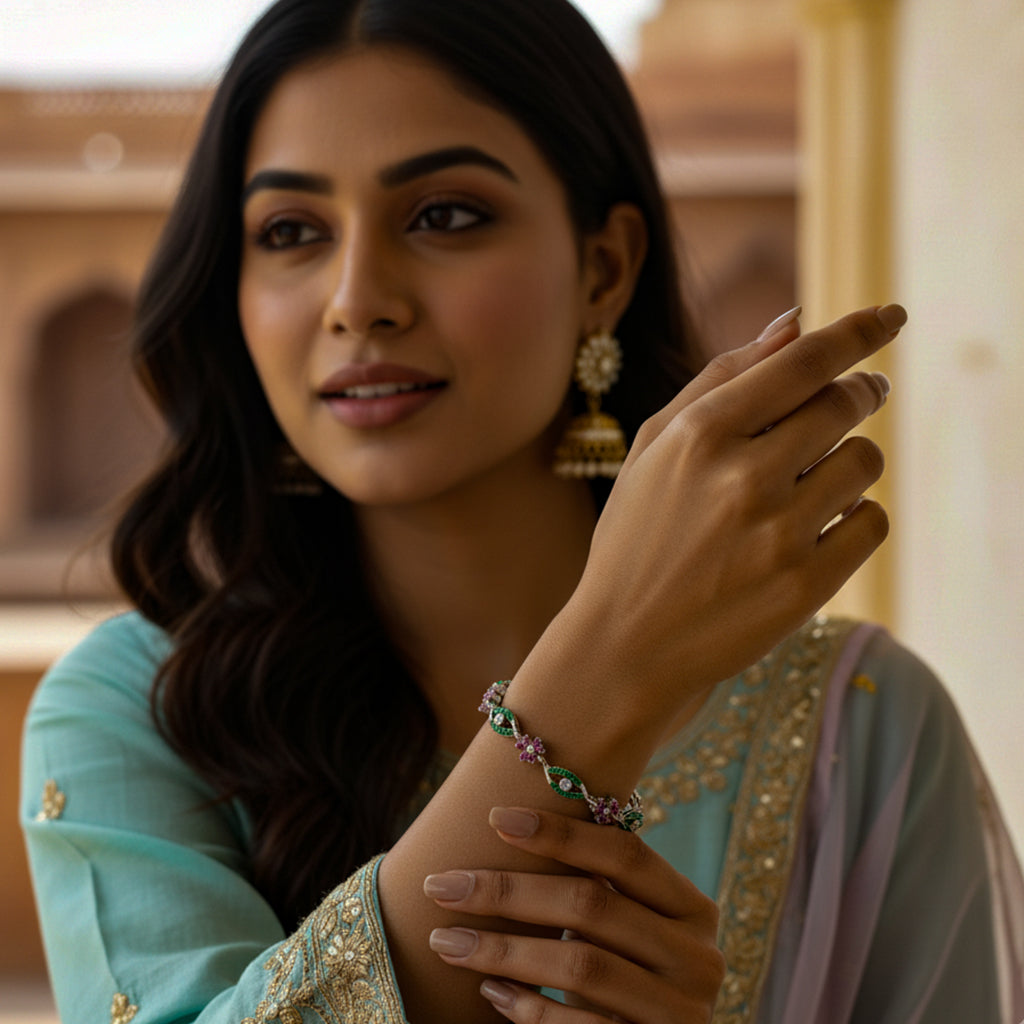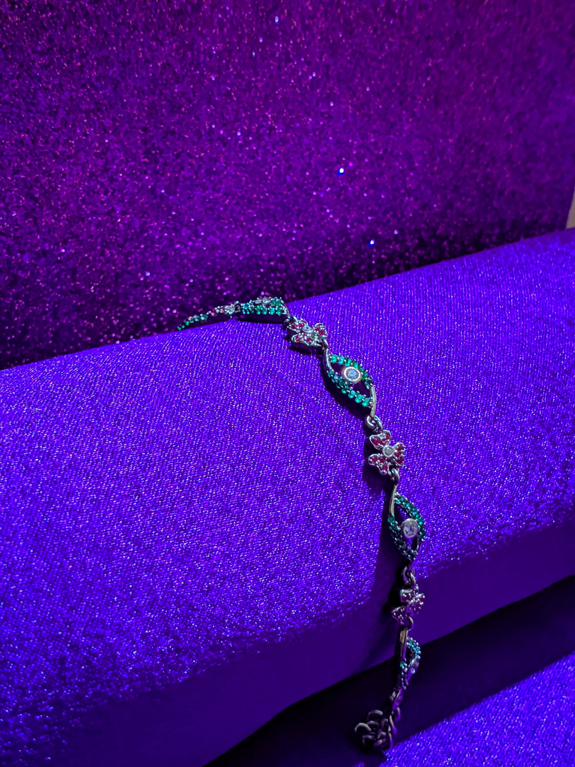 An elegant bracelet featuring leaf-like motifs embellished with sparkling green stones and delicate floral accents.