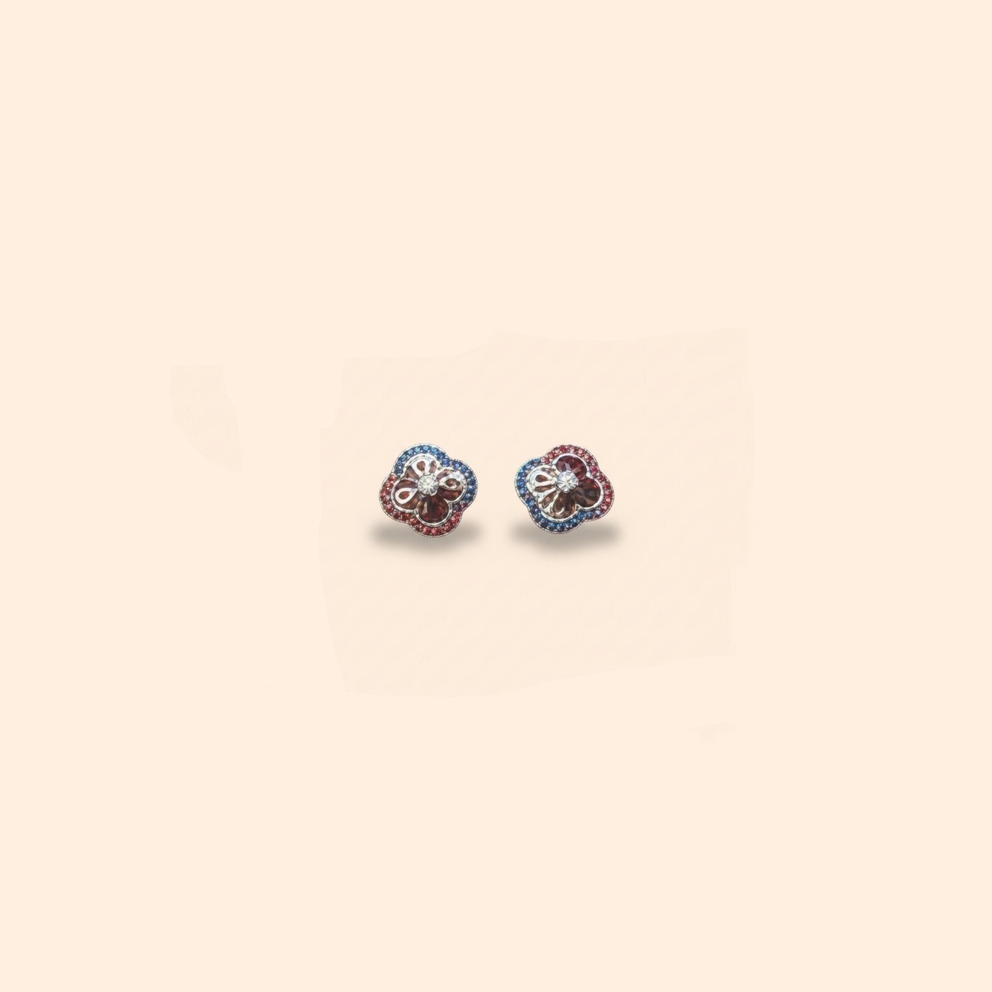 Enamel Flower Stud Earrings with Blue & Pink Gemstones