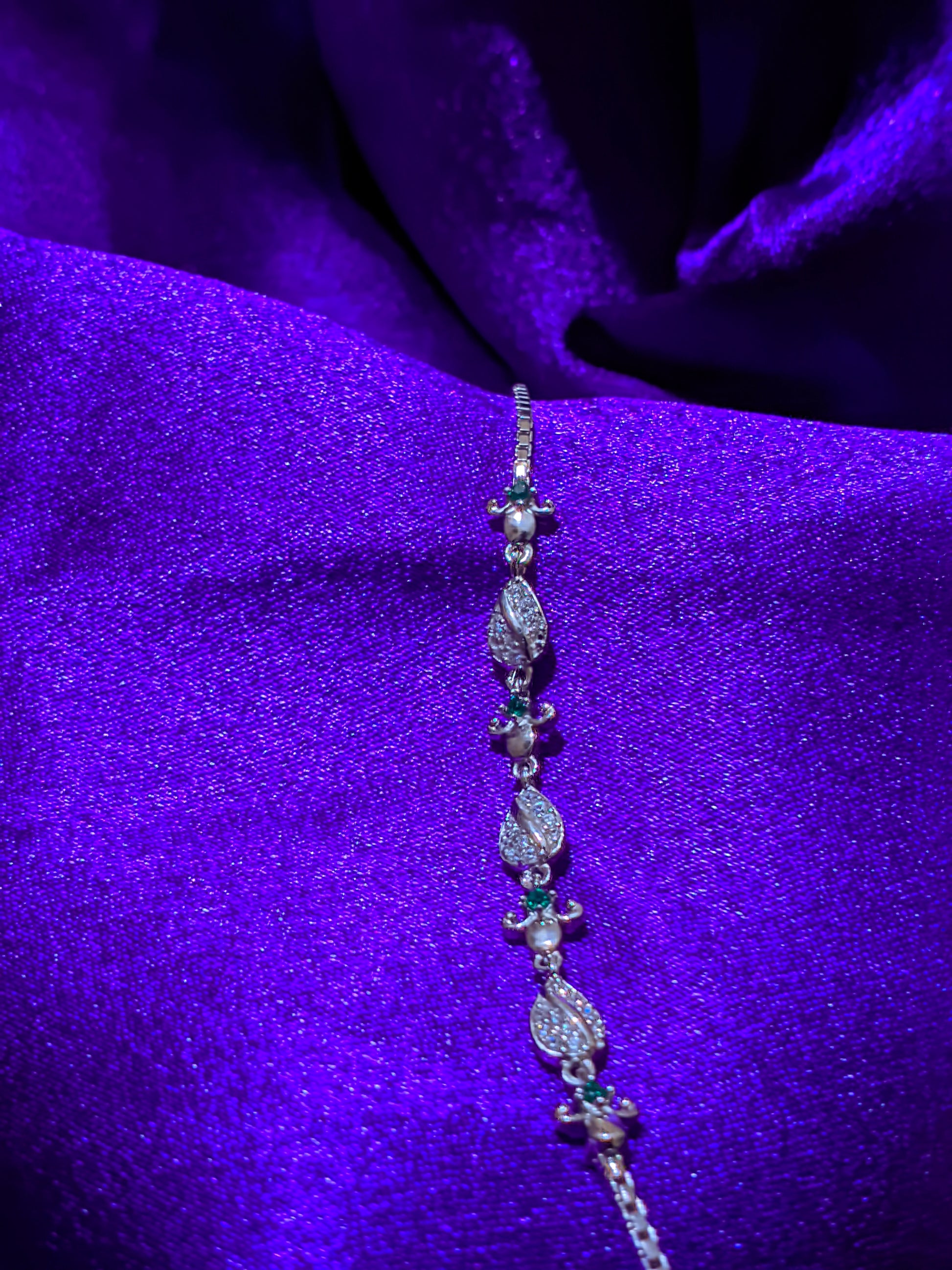 Elevate your elegance with the Pearl Leaflet Bracelet, beautifully crafted to highlight delicate pearls arranged like graceful leaves. This refined accessory adds a subtle touch of sophistication to any ensemble, perfect for both everyday refinement and special occasions. Its timeless design makes it a versatile addition to your jewelry collection.