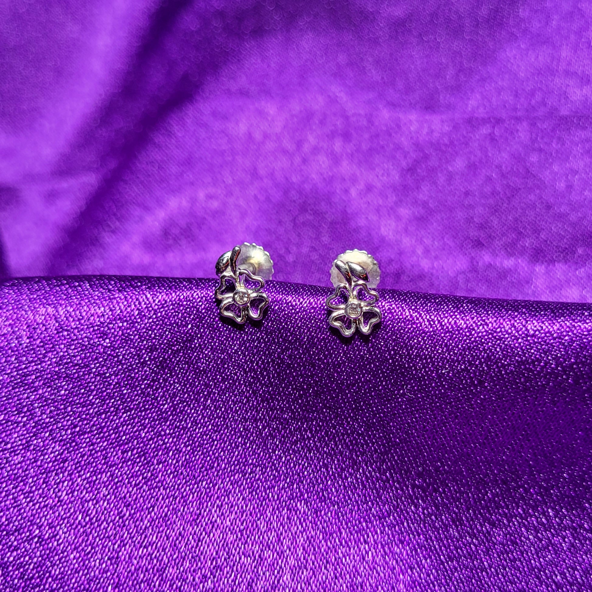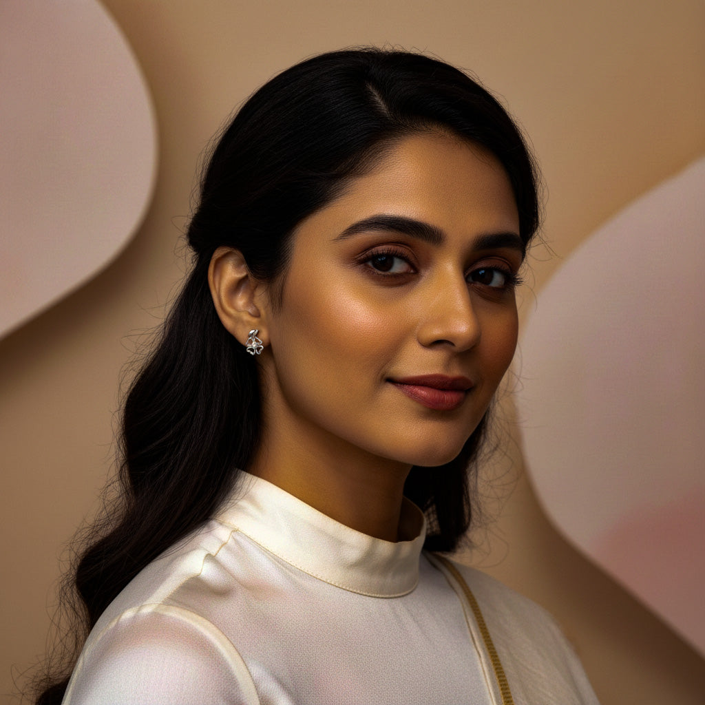 Delicate and elegant floral design featuring a minimalistic silver finish with a clear gemstone at the center. These studs offer a timeless and versatile look suitable for various occasions.